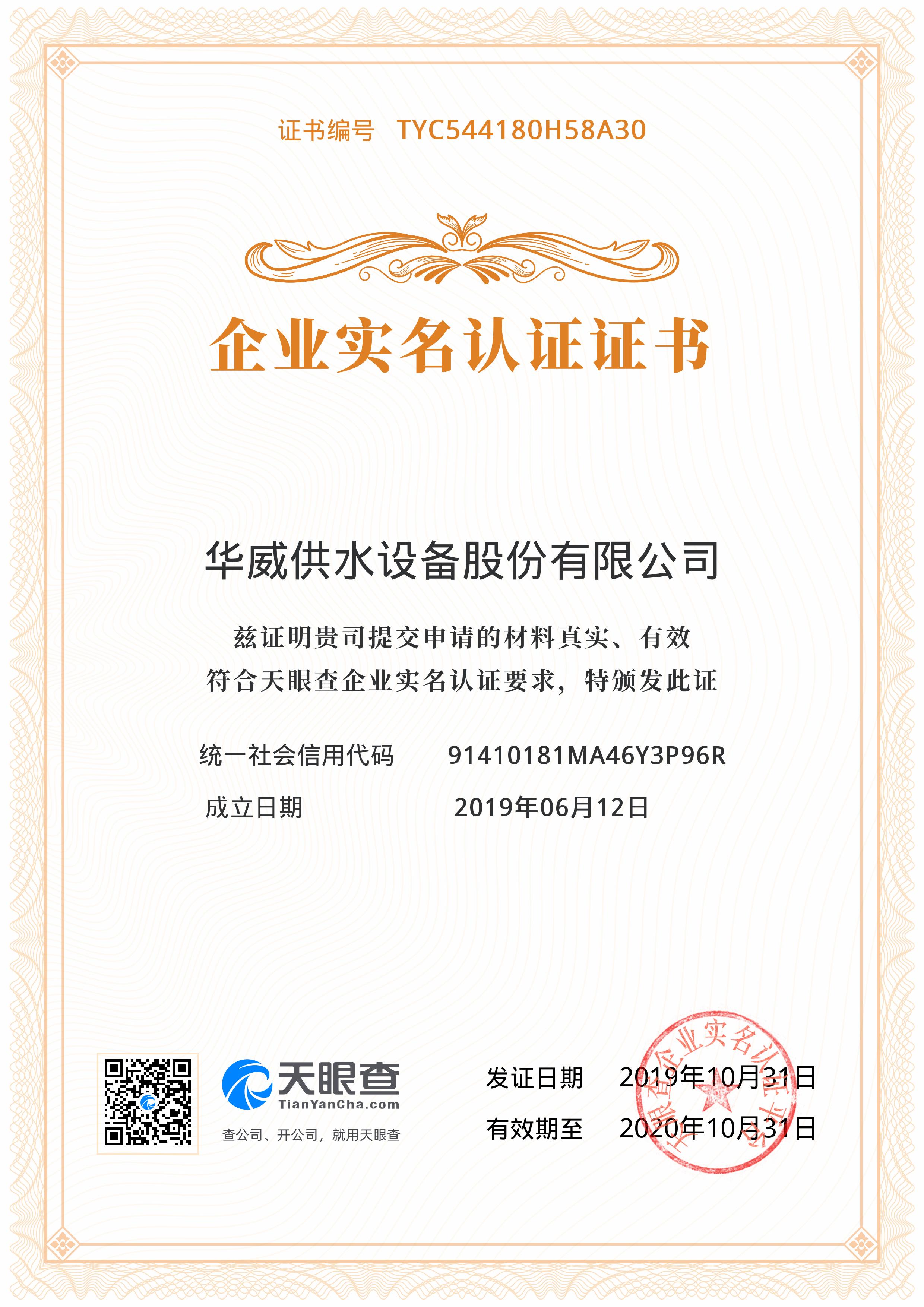 華威供水設(shè)備股份有限公司 證書(shū)編號(hào) TYC544180H58A30 法定代表人 吳金偉 注冊(cè)資本 5188萬(wàn)元人民幣 成立日期 2019-06-12 營(yíng)業(yè)期限 2019-06-12至無(wú)固定期限 企業(yè)類(lèi)型 其他股份有限公司(非上市) 登記機(jī)關(guān) 鞏義市市場(chǎng)監(jiān)督管理局 頒發(fā)日期2019-10-31 |