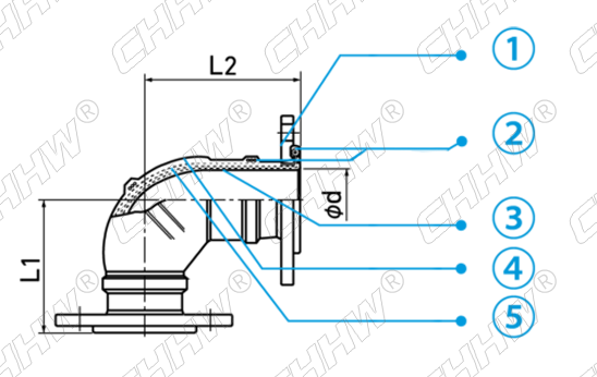 CHHW華威牌新型氣吹可曲撓橡膠彎頭,簡稱橡膠彎頭,是由織物增強的橡膠件與平形活接頭、松套金屬法蘭或螺紋管法蘭組成,用于管道隔振降噪、補償位移的彎頭。